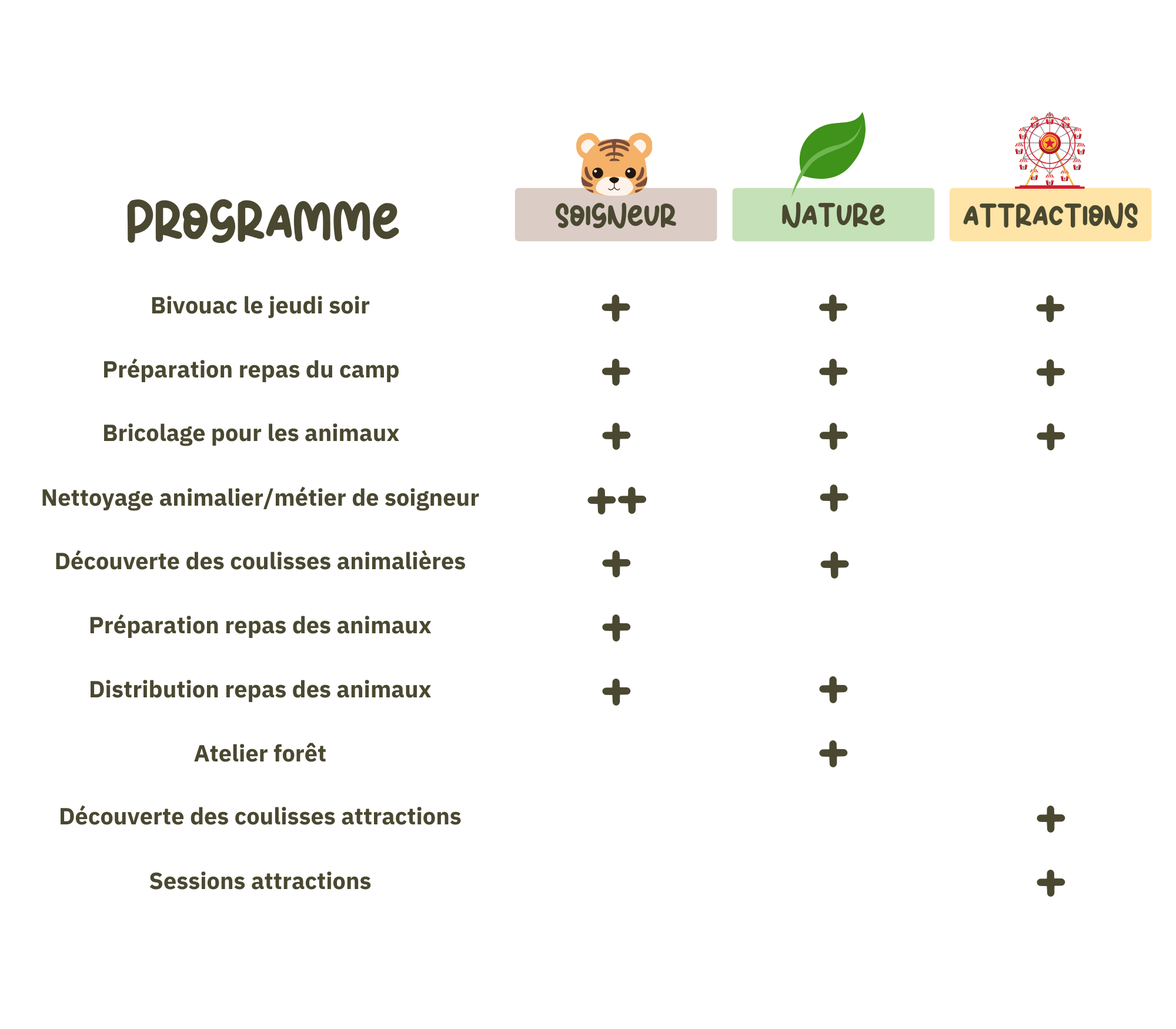 Différentes thématiques sont proposées aux jeunes pour s’adapter au mieux à leurs envies ! Quelle que soit la thématique du camp, les jeunes auront toujours l’opportunité de vivre des moments dédiés à la découverte des animaux. Notamment à travers des visites des coulisses et un bricolage pour les animaux en fil conducteur de la semaine. Cette dernière se terminera par une nuit en bivouac sur le parc, l’occasion idéale pour explorer la nature au crépuscule !