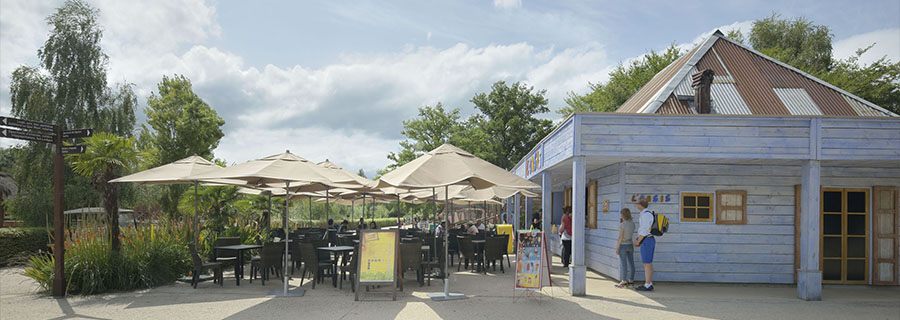 Avec une vue imprenable sur l'Ile des lémuriens, le snack L'Oasis vous propose des menus hot dogs et tenders de poulet ou végétariens, à partir de 11,90€ ainsi que des frites, gaufres, glaces et boissons à déguster en terrasse à proximité de la ferme des enfants.